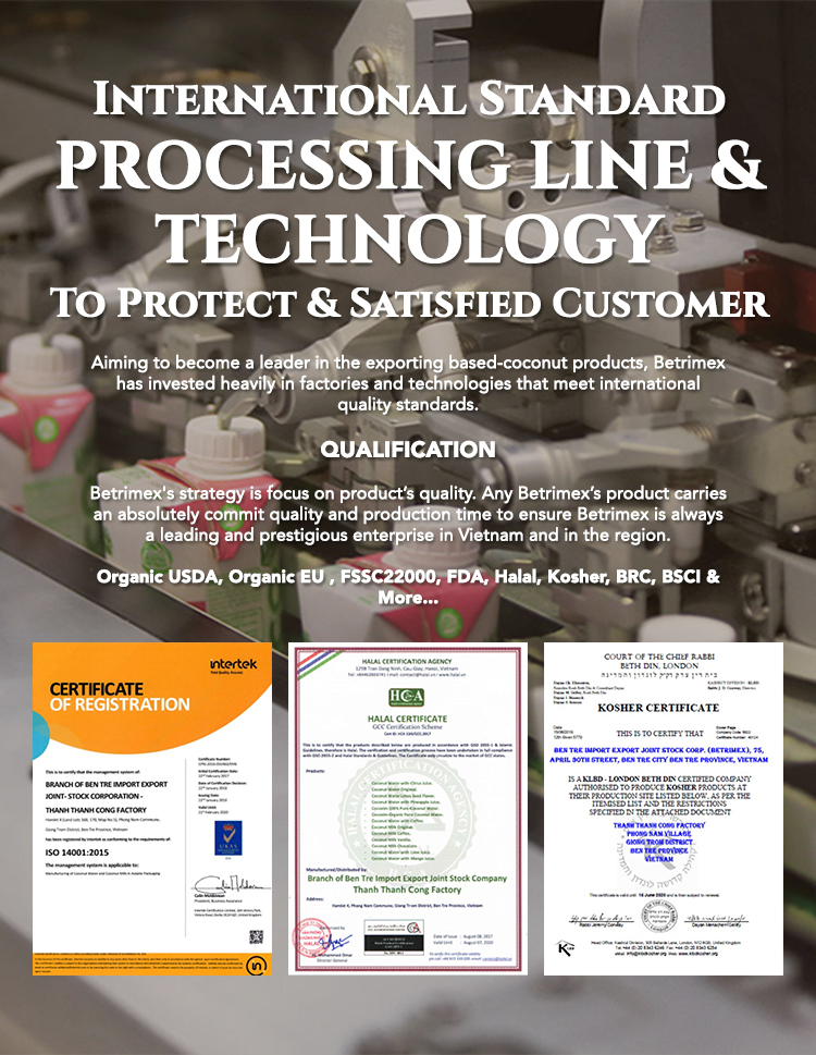 The product is made on Tetra Pak production line with direct UHT technology to preserve nutrients & fresh flavor of Ben Tre coconut.